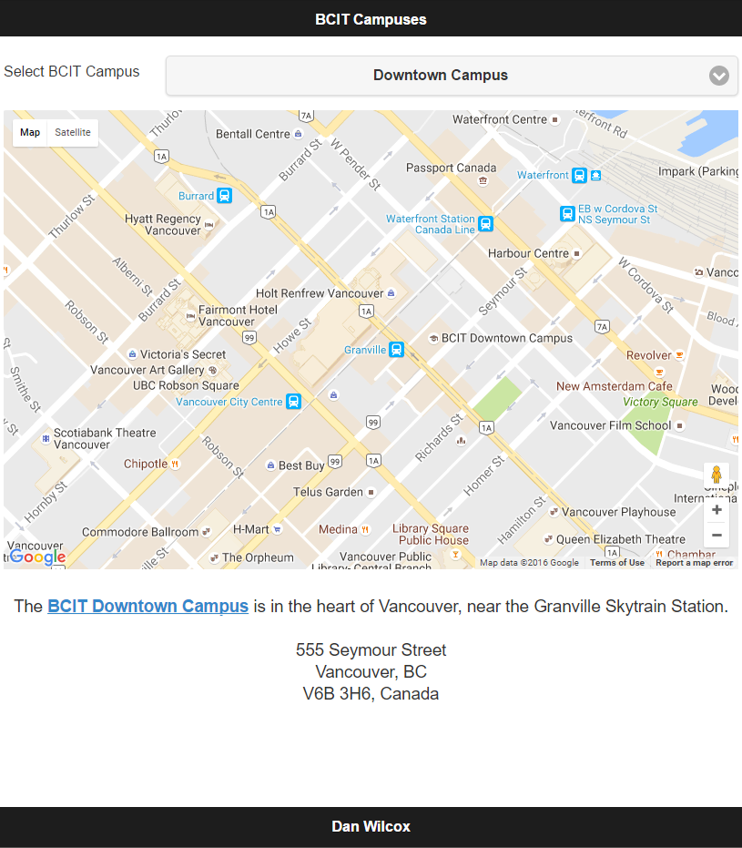My application shows a map and description of each of the BCIT campuses, based on the selected item from the dropdown menu.