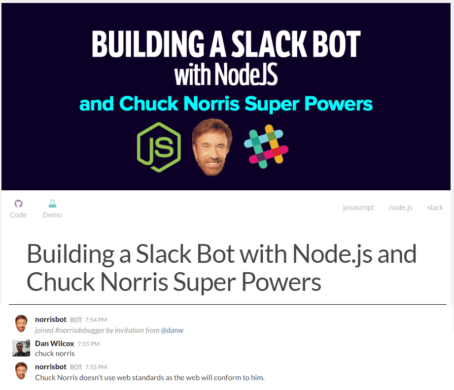 For my first back-end project, I created a Chuck Norris bot that provides Chuck Norris lines into the iQmetrix Slack application. This bot is based on the Scotch.io Node.js Tutorial, which incorporates Node.js, a local database, the Heroku platform, and a Slack webhook.